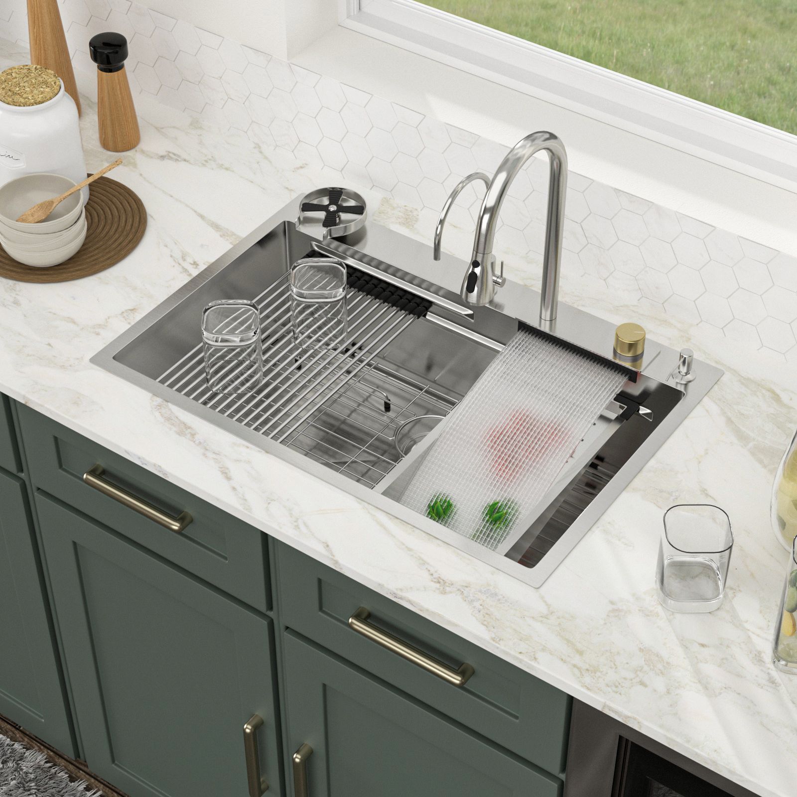 1.This 33-inch drop-in workstation sink constructed by brushed surface stainless steel which combine contemporary exterior design and scratch-resistant properties.