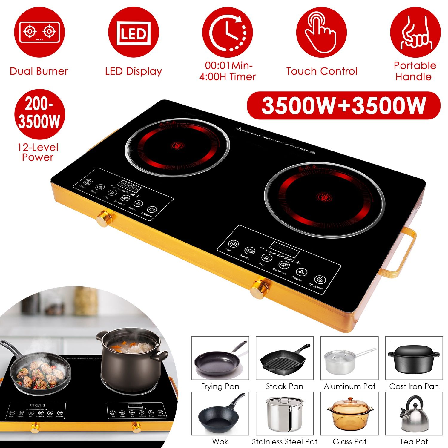 High-Power 7000W Electric Burner: Our double-burner cooktop runs on 110V and delivers rapid 3500W+3500W power for fast heating. With dual burner and individual touch-control panel, allows you to boil water while searing meat simultaneously, making cooking more quickly and efficiently, saving you much time. Start cooking instantly—no waiting. The convenient 0-4 hour timer lets you cook without constant monitoring.